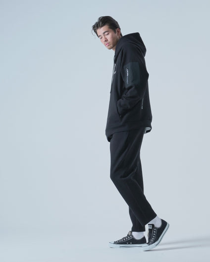 ゆったりとしたワイドシルエットでありながら、エアテンション®素材の持つ高級感でクリーンに着こなすことができる。